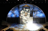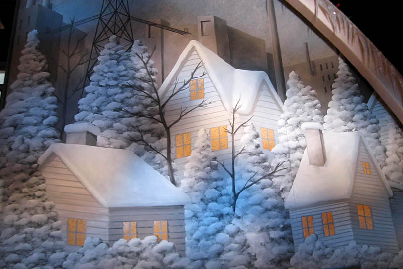 This show had several panels and a large backdrop designed to feel like an odd picture postcard. They all had translucent skies and windows, with opaque buildings and trees.