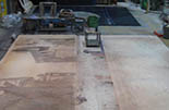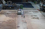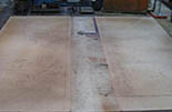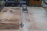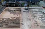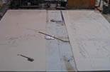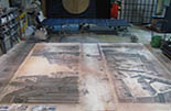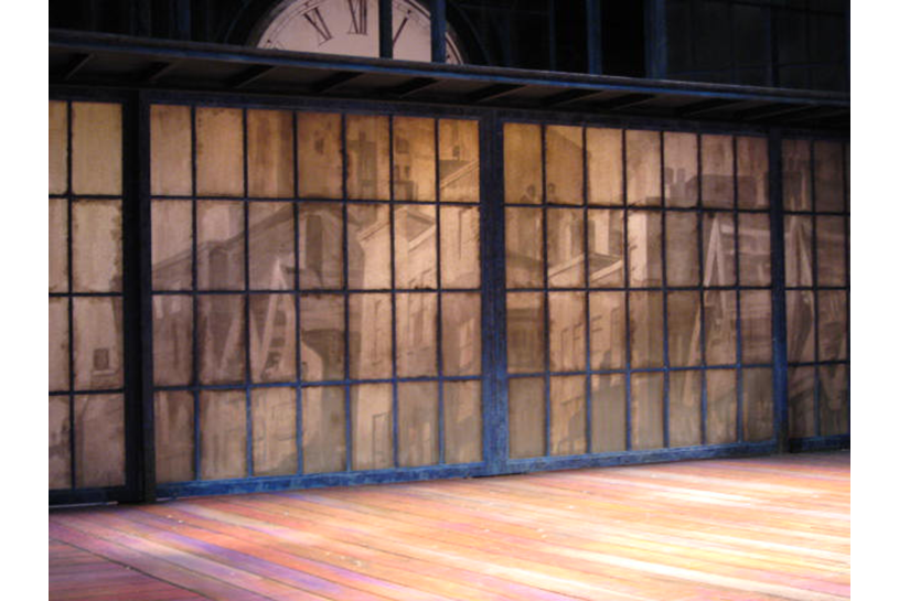 These photos show my process for creating the translucent drops lining the backs of window panels for A Christmas Carol.