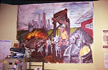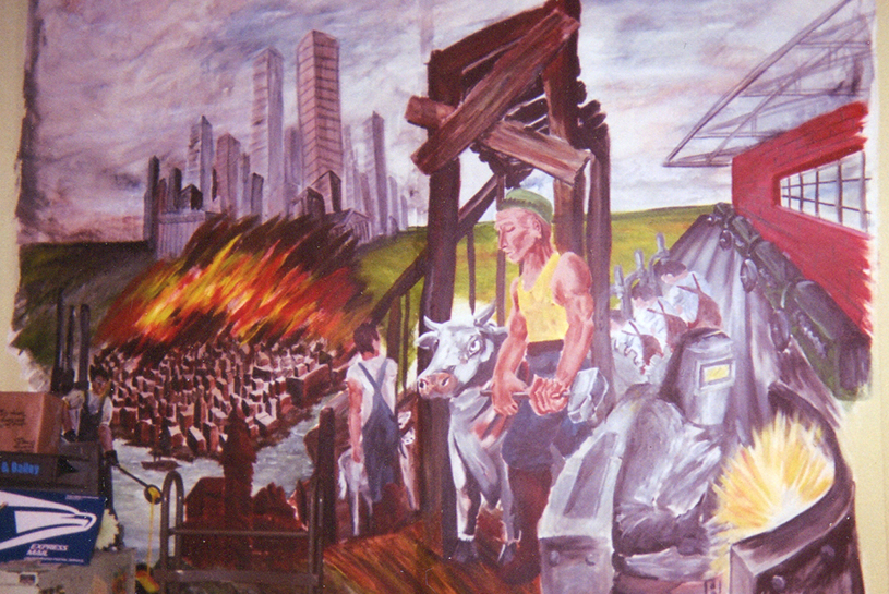I was hired to paint this WPA-style mural based on the history of Chicago and its major industries. It’s an amalgamation of a few real-life murals in Chicago post offices and gave me the excellent challenge of painting an angry cow through a Rivera lens.