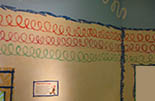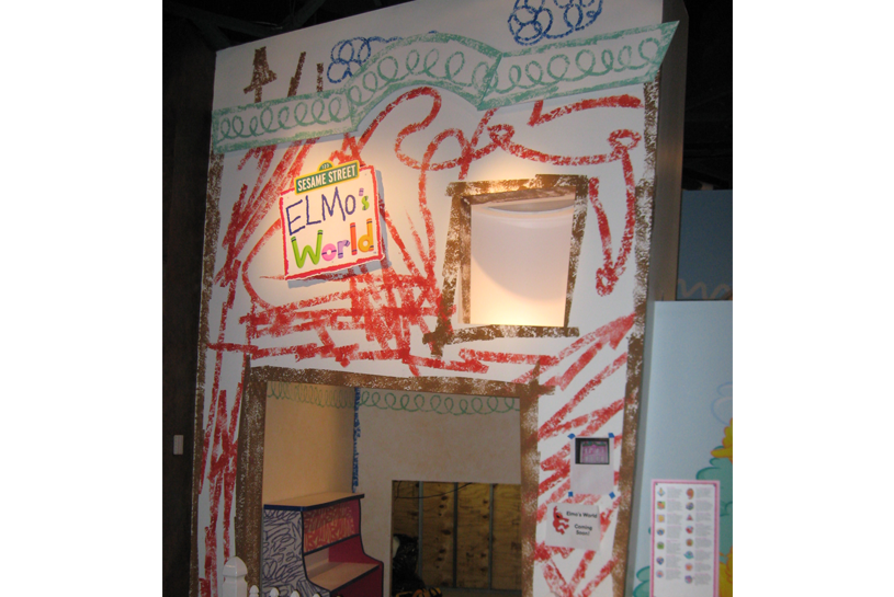This branch of the Strong’s Sesame Street exhibit is based on the Elmo’s World segment of the show. Everything had to look like a very large-scale crayon drawing. To achieve this, we made a set of stencils of line shapes that could be recombined to create different looks and then sponged through the stencils to create the visual texture of the crayon lines.