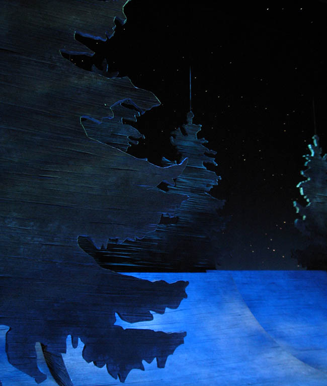 This show was full of textures. The main look of the trees and floor was achieved by stretching pleats into the muslin that covered everything, then sponging and blending color onto them. The window frost was created by a process involving cheap beer, Epson salts, and laundry detergent. And the entire set, floor and all, was rigged with LEDs so that at the very last moment the entire world could dissolve into two people on a bench in an endless field of stars.