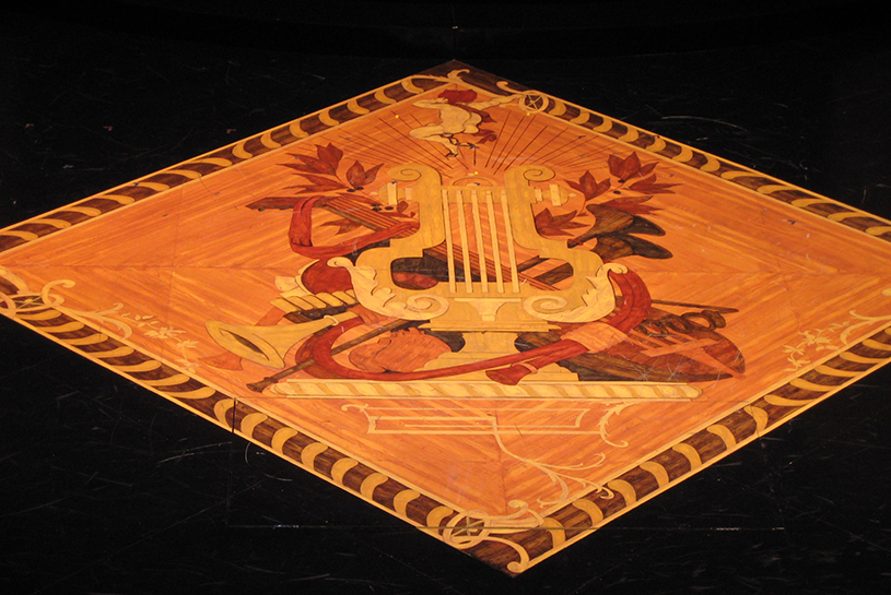 The gloss black set of Amadeus had this medallion of faux marquetry at center stage. Every area of inlay was masked off and carefully grained to mimic the style of wood that might have been used. A lot of research into real marquetry applications was essential to deciding how best to replicate them for stage.