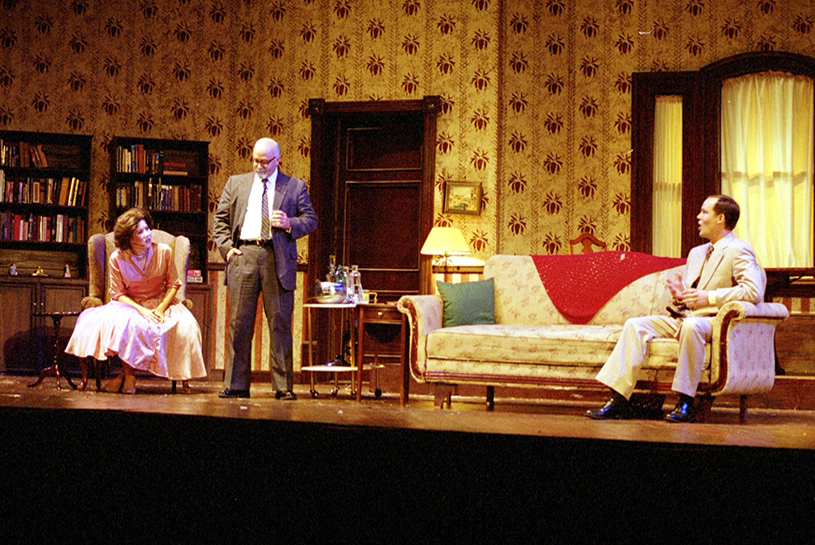 I created the wallpaper patterns for this show with a series of stencils applied over a ragroll. The other interesting aspect of the show was that, due to the distance from the stage to the audience, I had to accent the real dimensionality of moldings with painted highlights and shadows in order for them to read.