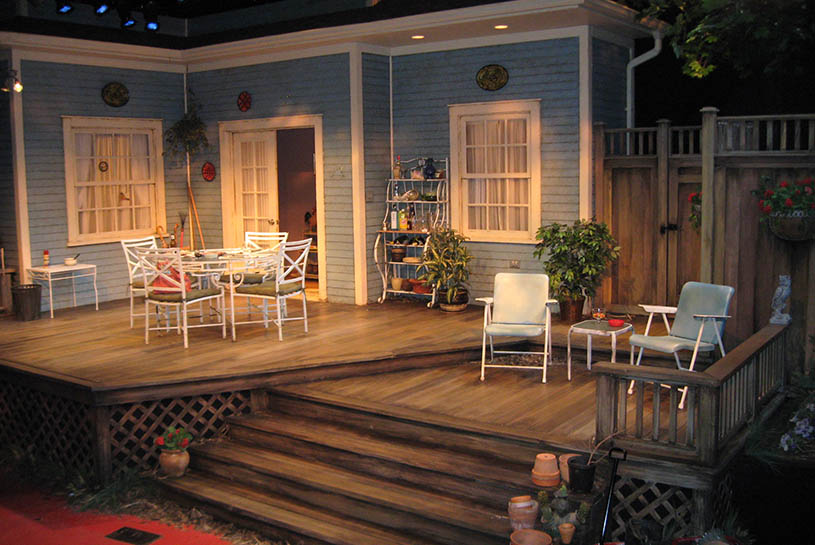 Because of the proximity to the audience, we had to be very subtle in approaching the mild deterioration of this house, but it had to be there. We ended up using a joint compound application to create a feel of mild organic wear and multiple layers of paint.