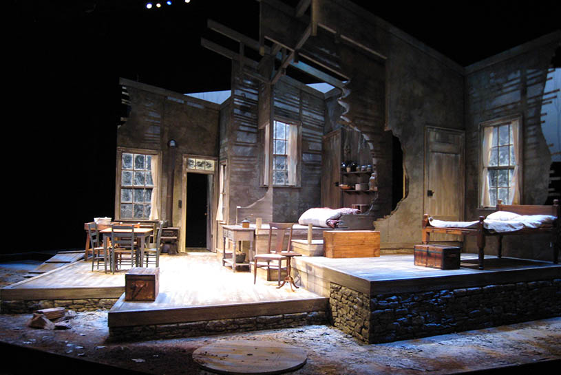 Between the semi-transparent walls and the organic ground cover, this set had a lot of interesting challenges. The ground ended up being the most interesting: a mix of roofing rubber, silk leaves, craft paper, raffia, floral foam, bead foam, and peat moss made for a convincing muddy mess.