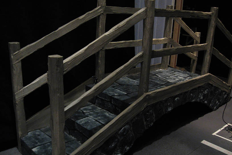 This footbridge was a fun texture project. For the railings, I began by reshaping the railings with a chisel and draw knife to give them a more organic shape, then covered them in cheesecloth to give an impression of roughness and grain. The stones of the facing were created by stapling crumpled muslin to the faces and wrapping over that with more cheesecloth.