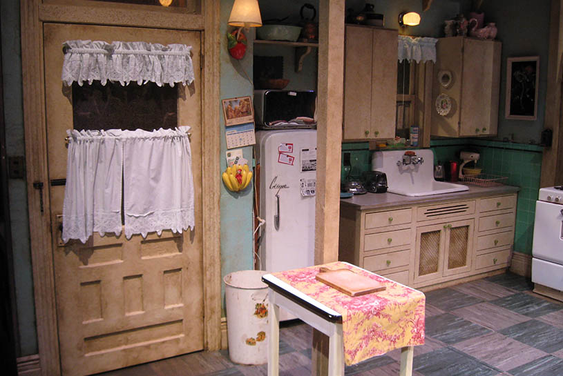 To create the oversized kitchen tiles for this show, we dragged strips of paint-soaked muslin over the base coats. A lot of attention was given to adding wear and age to this 1950s Buffalo apartment, and to recreating local ads and billboards to surround the set.