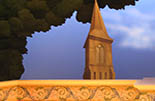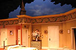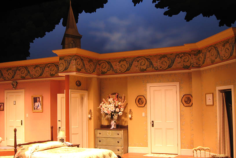 The biggest project of this show was creating the wallpaper border along the top of the room. We created a pounce for the shape, but the individual colors had to be applied with great care to maintain consistency across the set. The watercolor style of this application continued out onto the cut drop and steeple beyond.