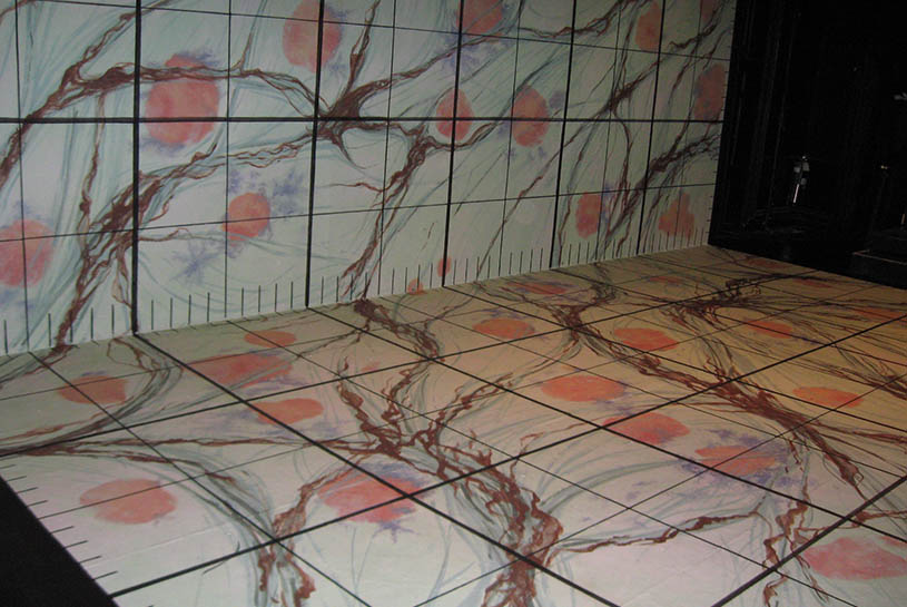 This set with its blown-up image of cancer cells had to be painted in place on a very tight schedule. The biggest trick was to keep the fluid quality of the floor consistent with the vertical wall surface.