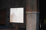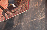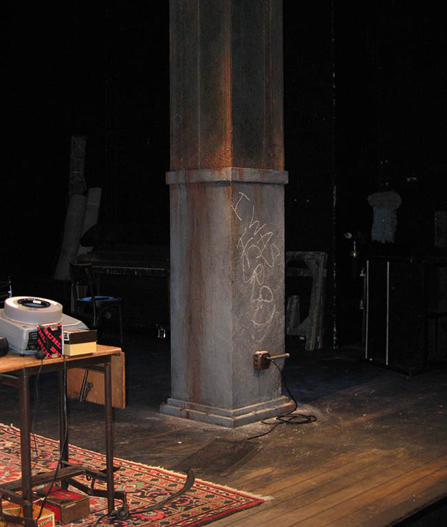Lintel was that classic kind of set that is supposed to look like there’s no set there at all. Consequently, the level of realism was very important. The floor had to look like a plank floor that had once been painted black. To achieve this, we painted the plank floor, glossed it intensely, painted over it with cheap flat black paint, then let our improv troupe and then this show rehearse on it. We added a little extra artful damage at the end and then sealed the whole thing for real just before opening.