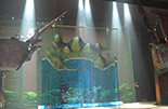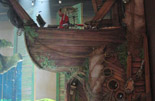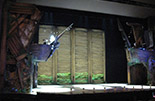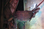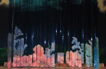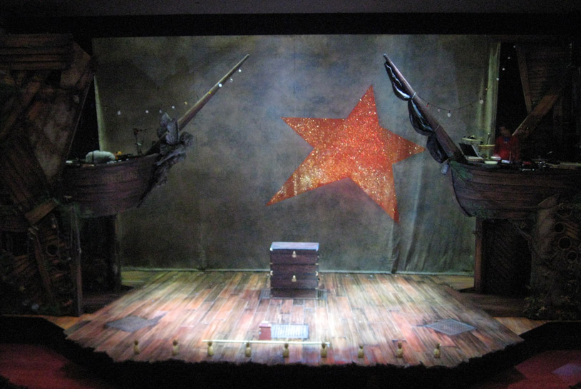 This design navigated the strange middle place between a Disney cartoon and a waterlogged cabaret. It was a world of varied textures and vibrant colors, pulled down with age, distress, and dampness. Add to that the vinyl, felt, and glitter of the Neverland drop and the crumpled, chartreuse groundrow, and you have a world where the seediness and wonder of this play can happily coexist.