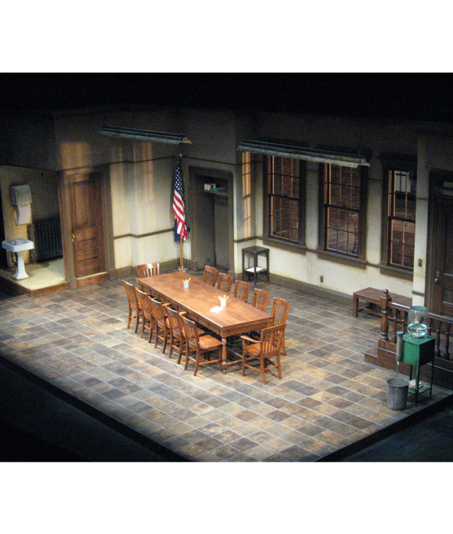 This show required absolute realism and attention to detail, from the faux tiles to the subtly aging plaster texture of the walls. Using the designer’s research as a guide, we infused this jury room with decades of use, wear, and tobacco smoke to create the stifling atmosphere in which these men are confined.